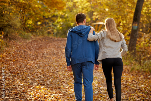 rear view on romantic young couple enjoying walk in the autumn sunny forest, contemplating the nature, yellow trees around. hiking, autumn forest, walking, love concept