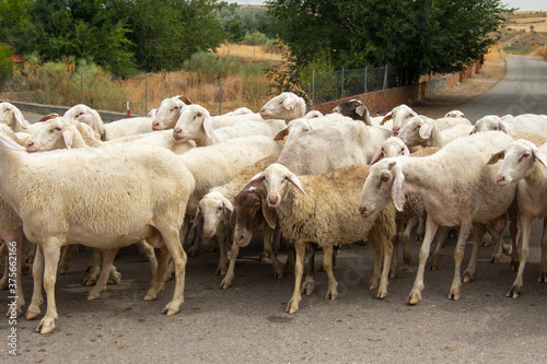 Rebaño de ovejas cruzando la calle del pueblo tras pastar