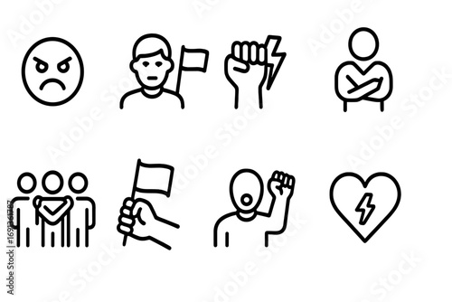 rebellion, expression, icon, outline, icon, set, expression, anger, determination, courage, defiance, oneness, hope, fearlessness, resilience, line, only, black, colours, consistent, stroke, weight, across, all, set