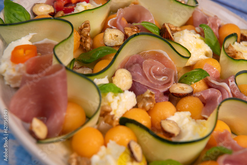 RECIPE FOR MELON, MOZARELLA, BASIL AND CURED HAM SALAD, CUCUMBER SLICE, ORANGE VINAIGRETTE. High quality photo