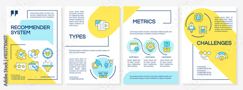 Recommendation system blue and yellow brochure template. Leaflet design with linear icons. Editable 4 vector layouts for presentation, annual reports. Questrial, Lato-Regular fonts used