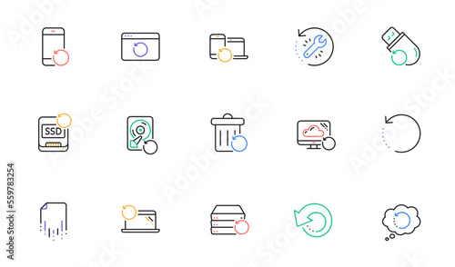 Recovery line icons. Backup, Restore data and recover file. Laptop renew, drive repair and phone recovery icons. Linear set. Bicolor outline web elements. Vector
