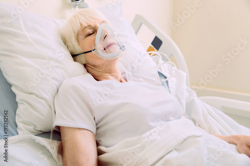 Recovery process. Senior lady sleeping gin a hospital bed and wearing a respiratory support mask while undergoing treatment.