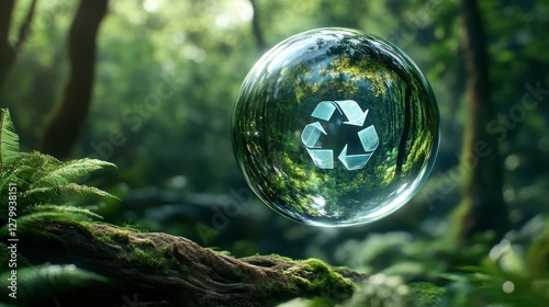 Recycle Symbol in Transparent Bubble Surrounded by Lush Greenery