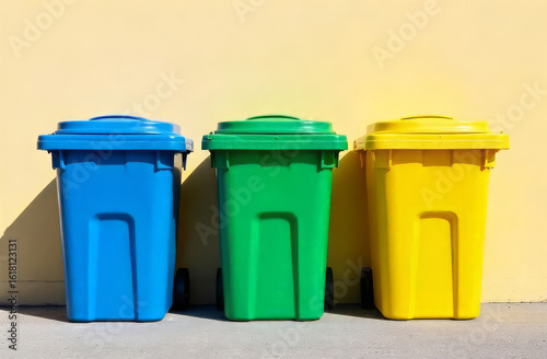 Recycling bins blue green yellow. Sorted waste containers. Trash management system.