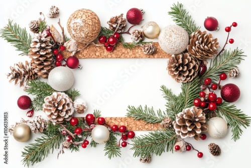 Recycling during festive seasons promotes sustainability. Rustic Christmas frame featuring a wine cork border and fir branches, perfect for holiday-themed designs and decorations.