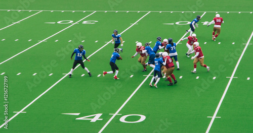 american football, team, teamwork, sport, field, competition, man, play, gridiron, football, game, athlete, success, victory, score, succeed, celebration, point, skill, determination, effort, defense, male, event, tournament, championship, stadium, fitness, outdoors, exercise, running, compete, performance, challenge, playing, international, jersey, group, match, broadcast, ball, training, fit, red, blue, helmet, uniform, athletic, green