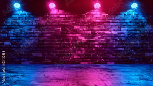 red, blue, neon light, brick wall, spotlight, nightclub, interior design, show, concert, background, vibrant, glowing, futuristic, illumination, urban, trendy, modern, nightlife, performance, entertainment, dancefloor, artistic, decorative, signage, electric, night scene