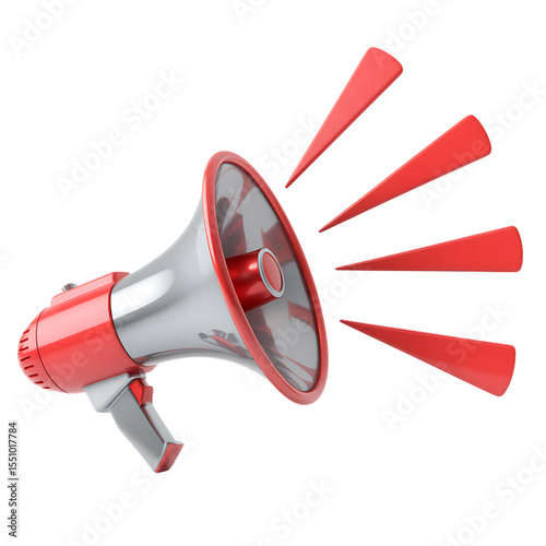 megaphone, bullhorn, announcement, communication, sound, noise, alert, warning, information, broadcast, public address, speaker, loud, voice, shouting, protest, rally, event, promotion, advertising, marketing, red, silver, modern, three-dimensional, illustration, isolated, graphic, object, equipment, technology