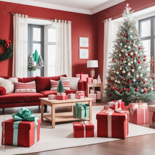 Red and spacious domestic living room decorated with Christmas fir tree and pastel holiday decor