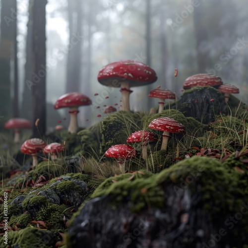 amanita, mushroom, forest, moss, surface level, fog, misty, tree, forest floor, green moss, vegetation, nature, outdoors, growth, toadstool, fungal, timberland, environment, ecosystem, blurred background, dark background, red, green, white, brown, autumn, leaf, fallen leaves, grass, stem, wood, trunk, tree trunk, underbrush, flora, debris, ground, mound, flocked, grouping, closeup, low angle