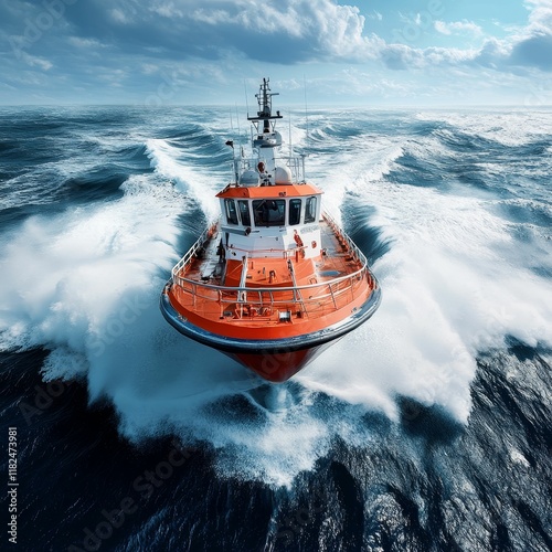 boat, ocean, wave, water, spray, vessel, maritime, nautical, transport, blue, white, orange, red, sky, cloud, stormy, rough, sea, power, speed, movement, front, view, forward, arousing, dynamic, energy, powerful, horizon, navigation