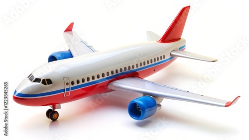 aeroplane, toy, model, aircraft, red, white, blue, plastic, wing, engine, tail, fuselage, isolated, white background, studio, photo, miniature, playtime, hobby, collectable, aviation, flight, travel, transport, jet, propeller, game, children, children, play, fun, leisure, object, detail, closeup, perspective, angle, commercial, marketing, advertisement, product, design