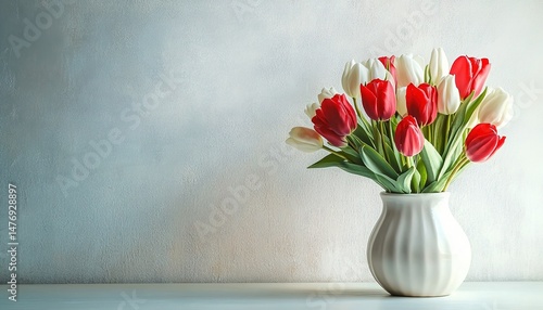 vase, white, red, tulip, flower, bouquet, green, leaf, background, surface, contrast, colourful, still life, indoor, decoration, nature, beauty, stem, simple, graceful, elegant, artistic, harmony, soft, freshness, vibrant, arrangement, light, wall, design, calm, serenity, minimalism, spring, floral, elegance, colours, balance, composition, focal, bloom, growth, simplicity, charme, life, joy