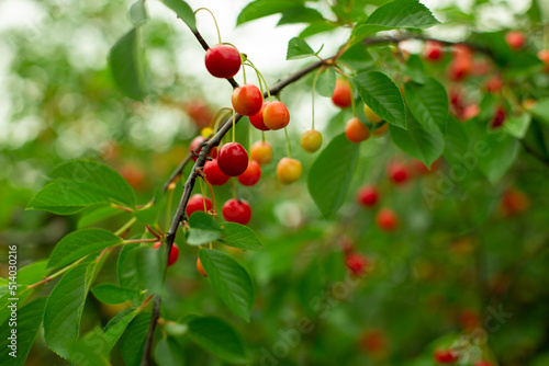 Red and yellow cherries on a tree branch among green leaves in the middle of summer