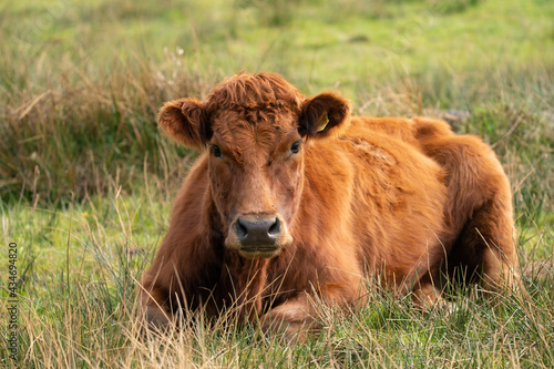 Red angus cow, the cow lies relaxed in a green Dutch meadow. Loo
