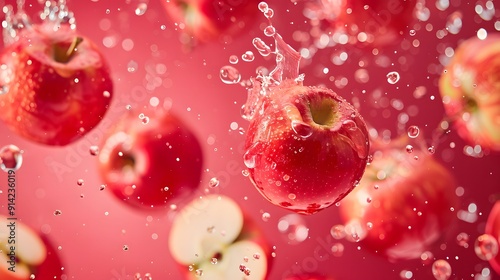 Red apple fruit on a splash of water on a red background for beverage packaging, web design, banners and fruit freshness