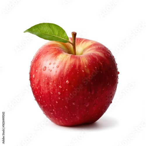 Red apple with curved stem on white background. Shiny surface, single green leaf. Vibrant fruit isolated for design, icons, web elements. Graphic illustration of healthy snack, juice, vitamin. Fresh