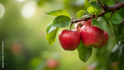 Red apples on a tree branch in a lush orchard, during harvest. Ideal for illustrating concepts of agriculture, organic food, and seasonal fruit.