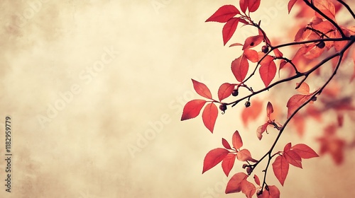 leaf, red, autumn, tree branch, beige, background, nature, fall, foliage, season, colours, branch, tree, plant, landscape, scenery, photo, image, picture, detail, closeup, texture, vibrant, artistic, beautiful, serene, peaceful, tranquil, stillness, harmony, balance, simple, elegant, minimalist, composition, frame, design, element, graphic, aesthetic