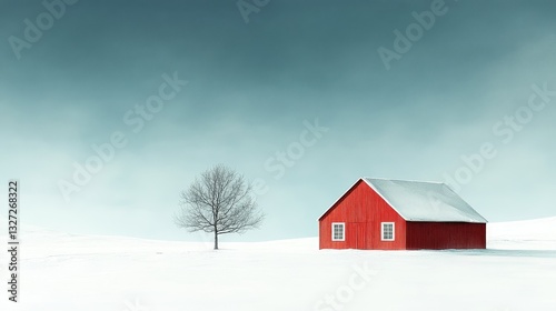 Red barn in snowy landscape, peaceful winter scene, tranquil setting