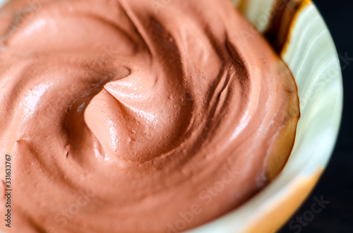 Red bentonite clay in the onyx bowl. Diy facial mask and body wrap recipe. Natural beauty treatment and spa. Clay texture closeup, selective focus.
