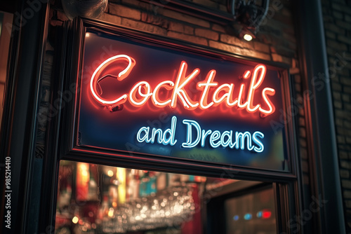 Red blue Neon sign pub text words "Cocktails and Dreams"