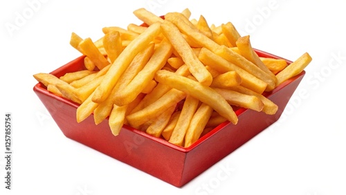 french fries, cardboard box, aerial photography, food photography, clipping path, depth of field, potato, fries, snack, fast food, eatery, take-away, delivery, food, photo, image, digital artwork, realistic, detailed, hi-res, closeup, studio, background, isolated, box, red, product, cardboard box, delicious, crispy, gold, healthy, unhealthy, commercial, poster, print, web, advertising, design, template