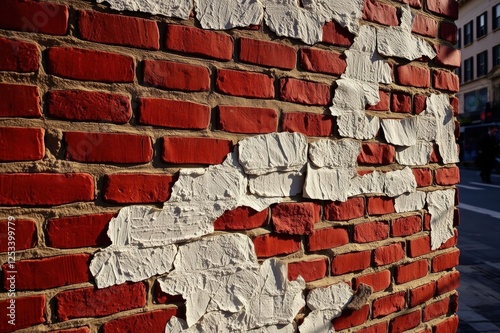 brick wall, redbrick, peeling paint, texture, background, weathered, aged, wall, architecture, building, outdoors, daytime, urban, detail, grunge, rough, damaged, copy space, 1, nobody, single, abstract, geometric, pattern, sunlight, shadow, vertical, closeup
