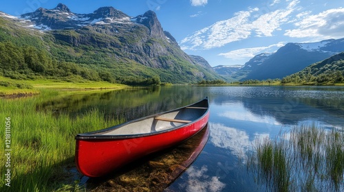 lake, canoe, mountain, water, nature, landscape, scenic, red, summer, sky, cloud, calm, peaceful, tranquil, serene, adventure, travel, journey, exploration, wilderness, view, beautiful, majestic, green, tree, vegetation, rock, sunlight, daylight, day, horizon, clear, blue, serenity, peace, quiet, idylli, relaxation