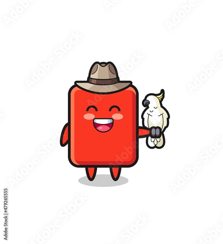 red card zookeeper mascot with a parrot