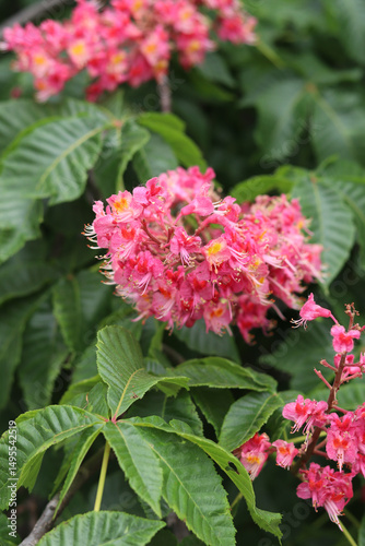 Red chestnut flowers with selective focus. Close-up of chestnut blossom. Beautiful chestnut tree in bloom. Chestnut flowers among green leaves, spring. Nature background