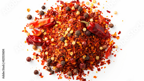 red chili flakes and spices in pile isolated on white