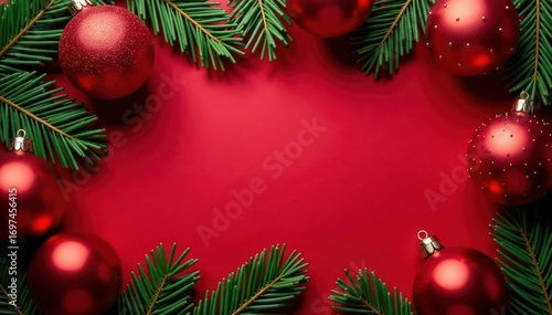 decor, card, winter, design, ball, red, red background, branch, christmas, topview, banner, festive, christmas decoration, bauble, tree, holiday, ornament, christmas card, fir, greeting, celebration, christmas, copy space, template, pine, frame, evergreen, background