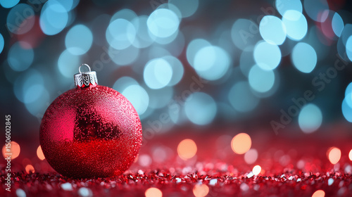 Red Christmas Bauble with Blue and White Bokeh Lights – Festive Holiday Background with Sparkling Glitter and Winter Vibes