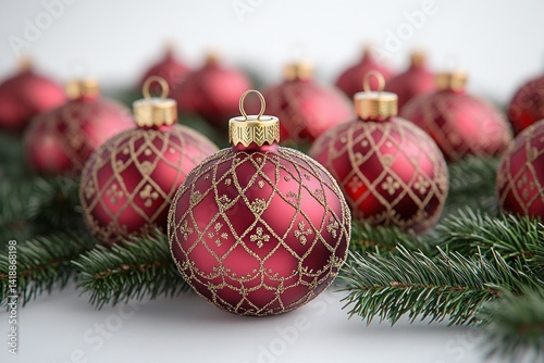 Red Christmas ornament with gold patterns and festive ribbon on white background with evergreen fir branches