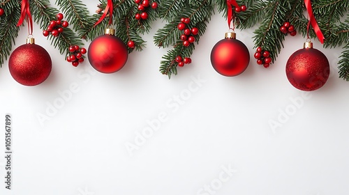 christmas, ornament, red, bauble, decoration, festive, holiday, celebration, winter, season, tree, tree branch, fir, pine, berry, ribbon, white, background, border, frame, joyful, merry, elegant, classic, simple, minimalist, topview, copy space, blank, template, design, greeting, card, invitation, banner, poster, advertisement, commercial, marketing, web, digital, graphic, illustration, wallpaper, pattern