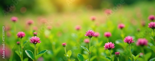Red clover flowers blooming in a lush green meadow, natural, landscape, field