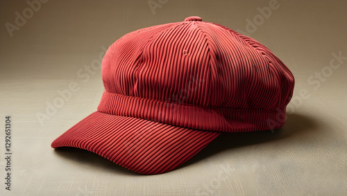 Red corduroy flat cap or baker boy hat angled on a neutral background. Casual headwear with a textured fabric and classic design. Fashion accessory.