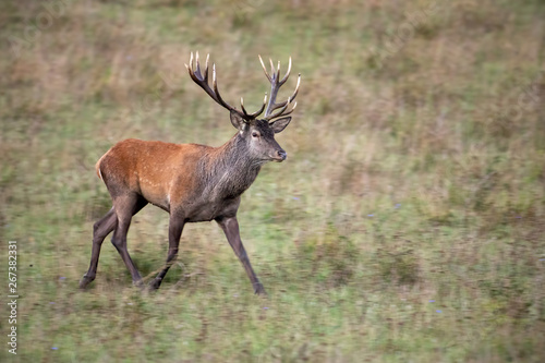 Red deer stag, cervus elaphus, walking on a meadow with dry grass in autumn. Wild animal migrating in nature with background blurred by motion.