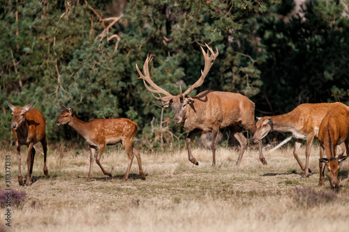 Red deer stag,Cervus elaphus, trying to get attention of the females in the forest in the rutting season in Hoge Veluwe National Park in the Netherlands