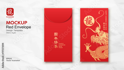 Red Envelope mock up, Ang pao Chinese new year dragon gold color retro style design, Characters Translation : Dragon and Happy new year, EPS10 Vector illustration.