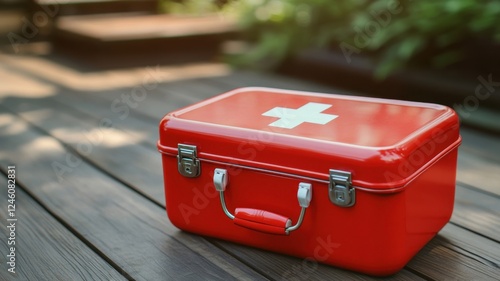 Red first aid kit placed on wooden steps in a garden during a sunny day