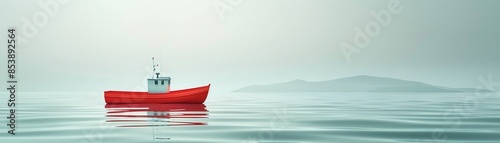 Red fishing boat with white details floating on simple, stylized waves, minimalist art style, flat design, soft color palette, serene and clean composition 8K , high-resolution, ultra HD,up32K HD
