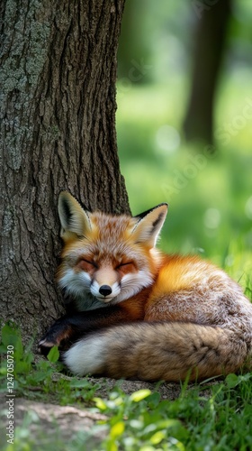 Red fox sleeping peacefully against a tree trunk in a lush green forest.