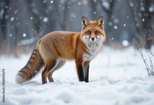 Red fox standing gracefully in a snowy forest during winter season