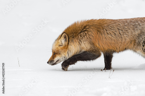Red Fox (Vulpes vulpes) Stalks Left Through Snow Winter
