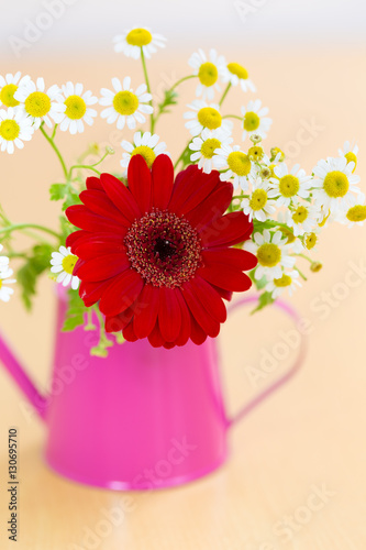 gerbera daisy, flower, bouquet, daisy, plant, floral arrangement, copy space, vivid, table, kettle, decoration, table, indoor, pretty, light, calm, red