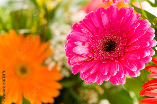 Red gerbera flower agaisnt green blurred background