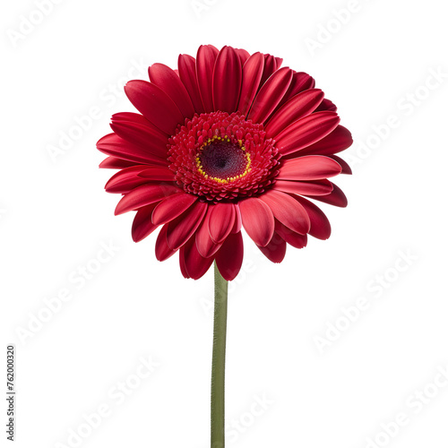 Red gerbera flower head isolated on white and transparent background closeup. Gerbera in air, without shadow. Top view, flat lay.
